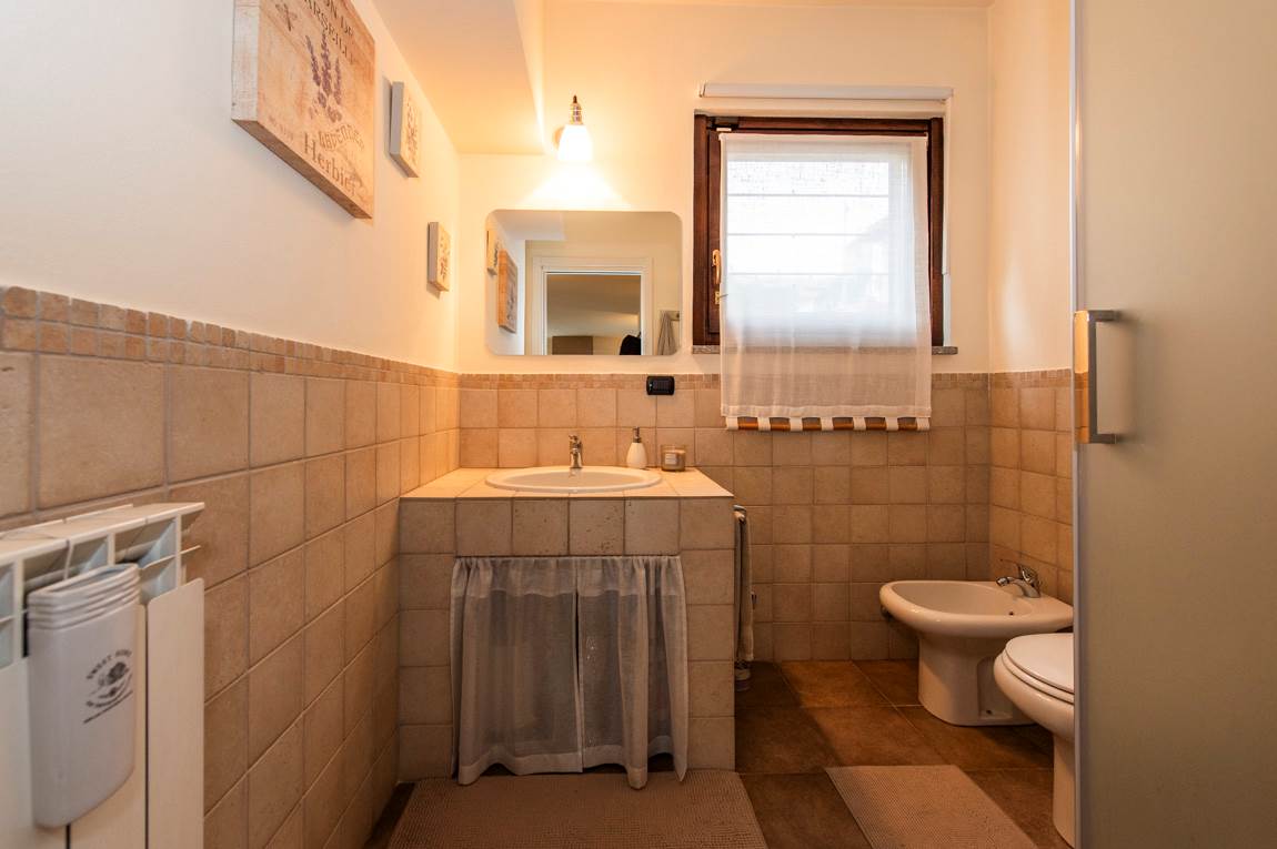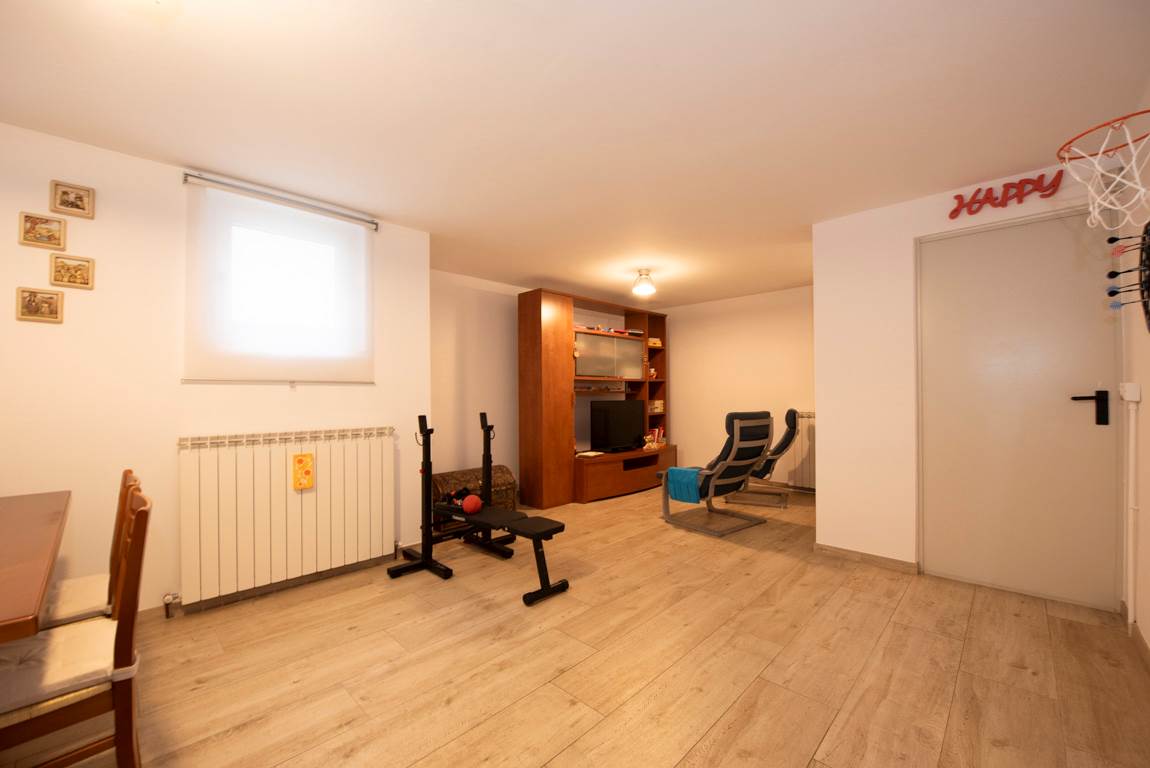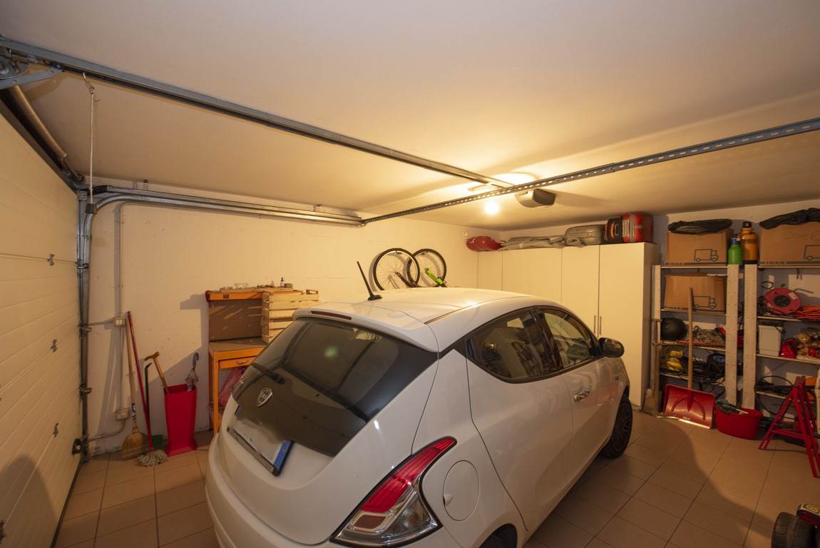 un grande locale con due finestre ben assistite da ampia bocca di lupo rivolta a sud / sud-ovest, un ampio locale con caldaia (anch'esso con finestra e bocca di lupo) ed un grande box auto di 34 mq catastali, con porta elettrificata di tipo sezionale.